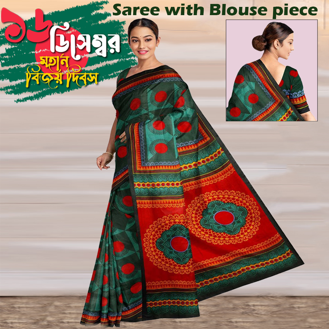 16 December Bijoy dibosh Red Green Saree Digital Print Saree , লাল সবুজ ডিজিটাল প্রিন্টের শাড়ি সাথে ব্লাউজ সিজ BD_817