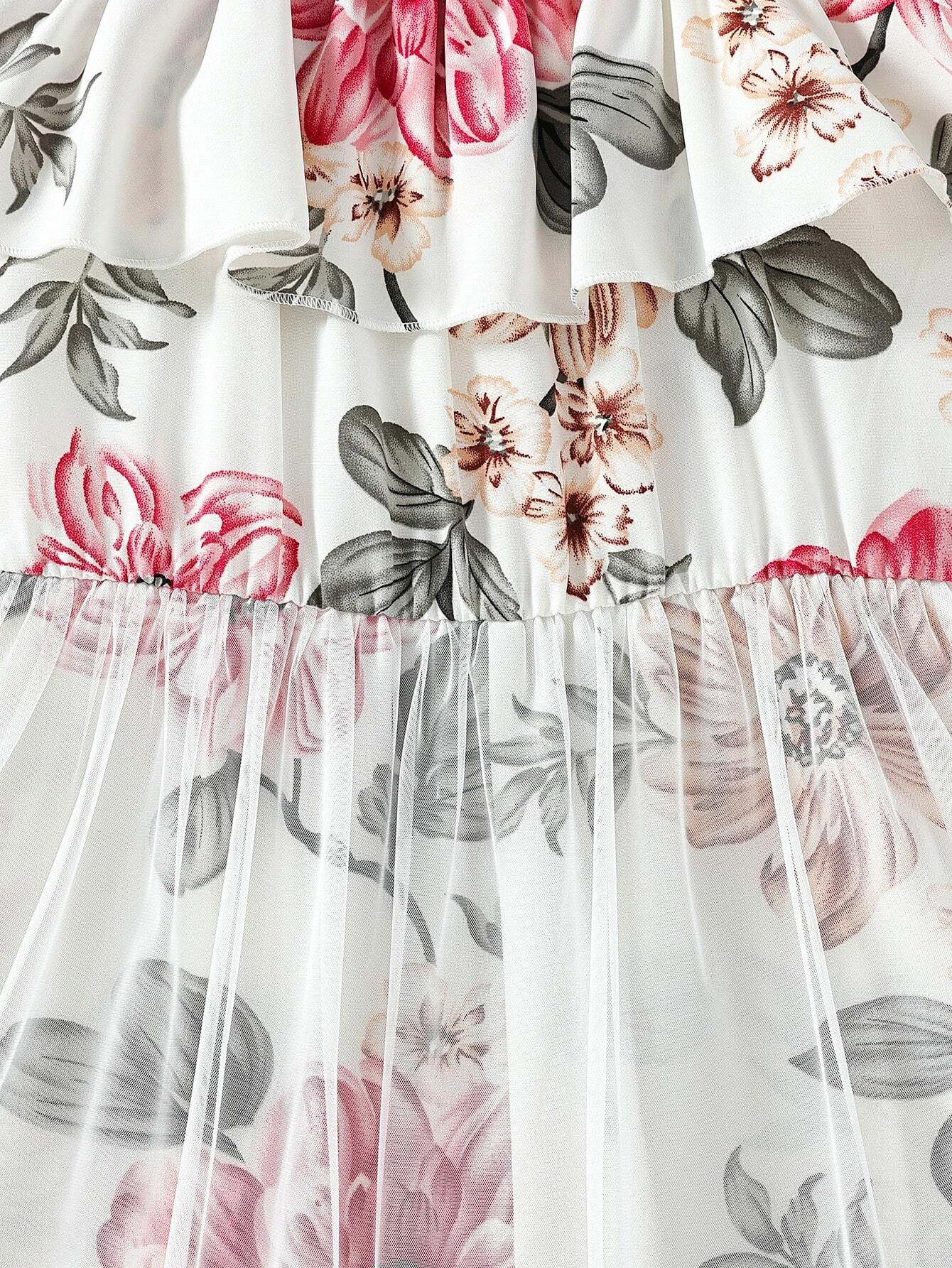 Flower Gown Elegant Floral Fit & Flare Cold Shoulder Ruffle Trim Contrast Mesh Party Dress For Baby Girls 1729