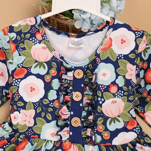 Girls Twirl Dress - Purple Floral Ruffle Party Dress with Buttons 1774